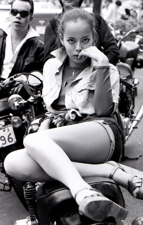 Группа асоциальных элементов-байкеров на улице Харадзюку — района Токио. 1970 год.